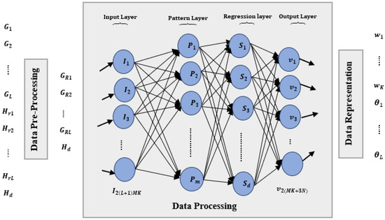 - The regression layer consists of linear neurons whose weights are set to the target values, denoted by T. Two types of summation operations are performed in this layer, which are symbolized as and , defined aswhere is the training response of the corresponding i-th input and j-th output.