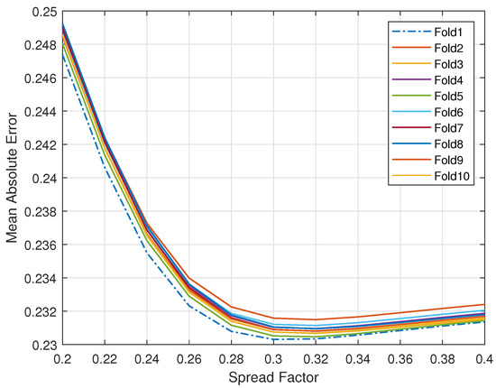 - The pattern layer comprises radbas (Gaussian) neurons, with a total number of neurons equal to the number of training samples received by the input layer. Layer units will store the non-linear relationship constructed between the generated response and corresponding input, e.g., bypassing the input via each unit in the pattern layer. Weights of this layer are computed as the transpose of the input channel coefficient vectors, , i.e., . At the same time, biases are , where the spread represents the width of a radial basis activation function used, i.e., spread ≤ 1. Then, the i-th pattern neuron’s equivalent transfer function is given bywhere denotes the squared calculated distance between the input vector and the learned vector of the i-th neuron, and m is the cardinality of pattern layer neurons.