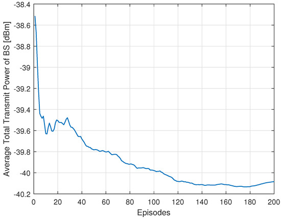 - Reward: Since the total transmit power minimization at the source is the objective function of the presented optimization problem, linking the objective function and the reward will permit the achievement of MDP’s goal of increasing long-term rewards. Accordingly, the instant reward feedback by the environment in this model is defined as the overall energy efficiency, i.e., the ratio between the total achieved rate and total transmitted power. Considering the SINR constraints, the SINR of each UE should be above the SINR threshold to satisfy the required QoS threshold. When the resulting UE’s SINR is below the threshold, a penalty is applied to help the agent to alter the inappropriate beamforming. In our designed reward function, we impose the penalty value as zero or can simply assume that an unsuitable action leads to the Inf value of the corresponding total transmit power. Hence, the instant reward at each time step t can be calculated as follows: