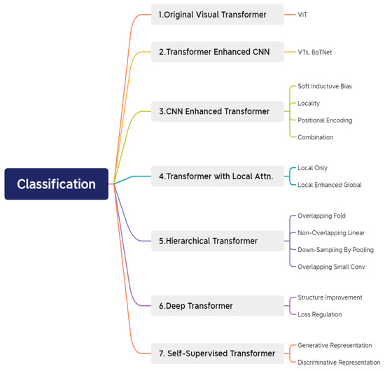 The backbone network extended by Transformer can be divided into seven categories according to motivation and implementation [36], as shown in Figure 1. The original Visual Transformer (ViT) is a well-known method that has been widely adopted. Another method is the Transformer-enhanced CNN, which uses the strong global modeling ability of Transformer, to improve the long-distance dependence of the CNN backbone. In contrast, the CNN-enhanced Transformer introduces convolution-induced bias, to enhance Transformer’s performance. Local attention-enhanced Transformer is another method that maintains a convolution-free architecture while enhancing the locality of Transformer, by redesigning block partitions and attention blocks. The Hierarchical Transformer, replaces the fixed-resolution columnar structure with a pyramid-shaped backbone. Additionally, the Deep Transformer prevents overly smooth attention maps, by increasing their diversity in the deep layers. Lastly, Transformer with self-supervised learning, is an approach that uses self-supervised learning techniques to enhance the efficiency of Transformer.