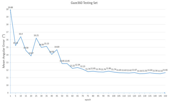 Training Gaze360 dataset: we trained the model using the AdamW optimizer, in the PyTorch 1.10 framework, with an initial learning rate of 0.0001 and exponential decay, with a decay rate of 0.97. The Gaze360 dataset has three evaluation ranges based on the range of gaze angles: full 360°, fronting 180°, and front-facing (within 20°). Based on the data processing and cleaning described earlier, we trained and evaluated the model on the front 180° and front-facing (within 20°) datasets. We trained the model for 150 epochs, and the mean angular error loss curve on the testing set is shown in Figure 8.