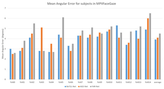 We employed the leave-one-out cross-validation strategy, used in related works [12,18,31], to validate our model on the MPIIFaceGaze dataset. Table 3 shows a comparison between our proposed model and the state-of-the-art method, in terms of mean angular error, on the MPIIFaceGaze testing set. As previously mentioned, the MPIIFaceGaze dataset was tested using leave-one-out cross-validation, with different training and testing sets in each round. The average of 15 rounds was taken for evaluation. BoT2L-Net achieved a mean angular error of 3.97°, which is 0.12° better than AGE-Net. We also provided the mean angular error of BoT2L-Net for each subject tested on the MPIIFaceGaze dataset and compared it with FAR-Net [32] and AGE-Net [12], as shown in Figure 9.