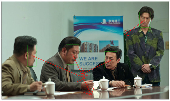 Gaze estimation in the video. The green frames represent the result of face detection and the red arrows represent the result of gaze estimation.