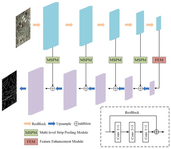 This method uses multi-level strip pooling combined with a feature enhancement module to ensure road connectivity and road edge details. The goal of the multi-level strip pooling module is to obtain the global context information and long-range dependencies and connect the discretely distributed paths in the image. The feature enhancement module is used to obtain the road’s local context information and improve the road edge’s segmentation effect.
