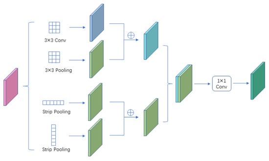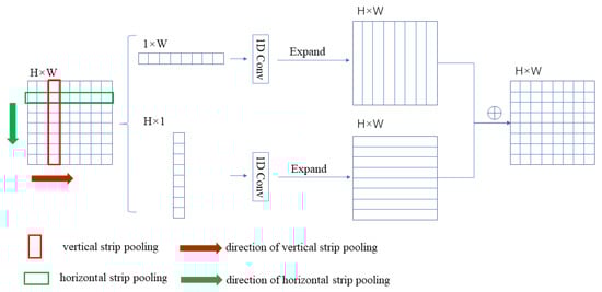 The strip pooling in Figure 2 is similar to the traditional pooling method, and the pixel values are averaged over the locations on the feature maps corresponding to the pooling kernels. A feature map is an input, here actually C × H × W. For ease of description, only one channel is drawn. The feature map input processing principle of C channels is the same as that of one channel operation shown here. After horizontal and vertical strip pooling, the input feature map becomes H × 1 and 1 × W. The element values within the pooling window are averaged, and the value is used as the pooling output value. Subsequently, one-dimensional convolution is conducted on the output values, and the two output feature maps are expanded along the horizontal and vertical directions. Then, the two feature maps had the same size, and the expanded feature maps corresponding to the same position were summed to obtain the H × W feature map.