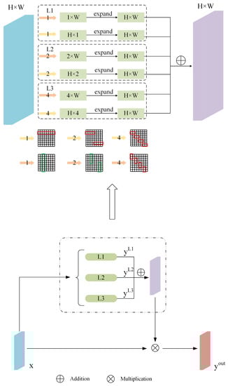 The framework of MSPM is shown in Figure 3, which contains three strip pooling sub-blocks of different sizes, L1, L2, and L3, respectively. Input feature is processed by the L1, L2, and L3 sub-blocks, respectively, then the model obtains three output features , , and and add the corresponding position of , , and . The last operation is to multiply the summed result with the input . Finally, there is the output result of MSPM, can be expressed as:
