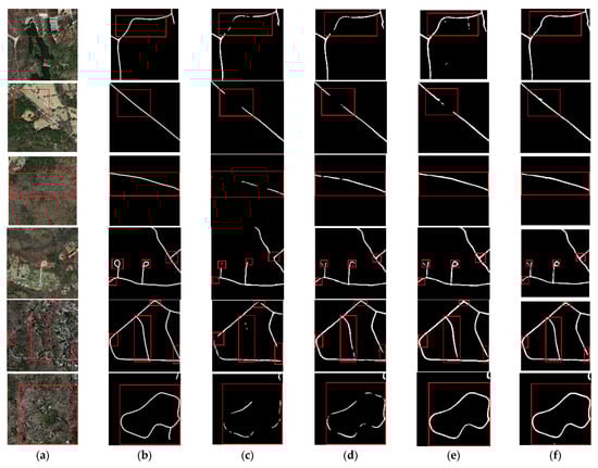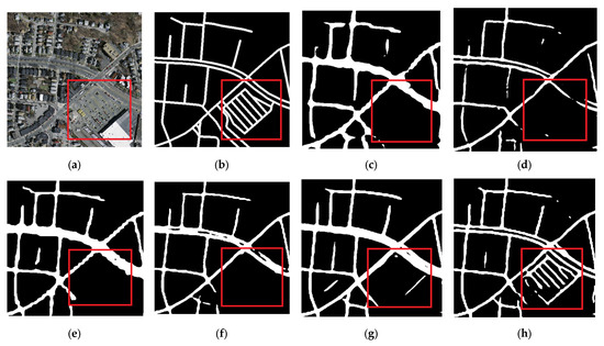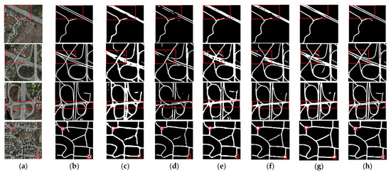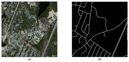 Massachusetts Roads Dataset [40] is used in the experimental dataset as shown in Figure 5. The pixel size of the Massachusetts Roads Dataset is 1500 × 1500, and there are 1171 pairs of images and labels. In this experiment, the number of training images, test images, and validation images is 1108, 49, and 14, respectively.