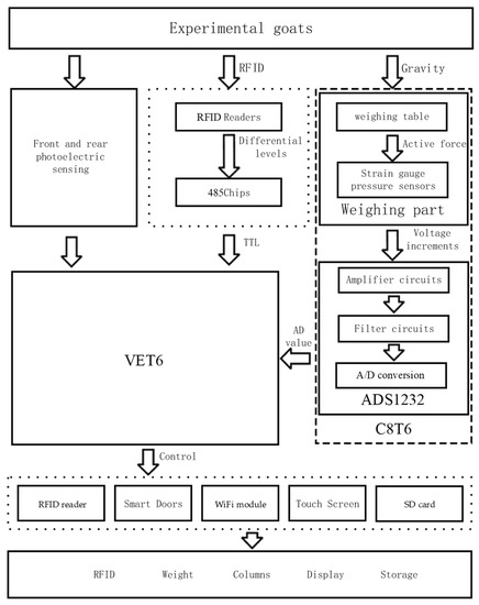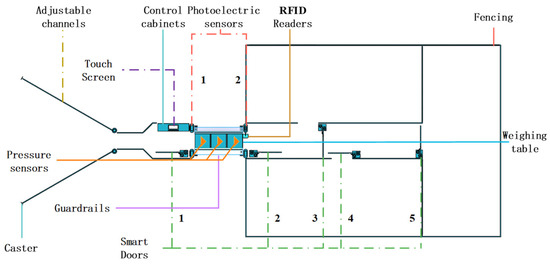 The structure of the sensor is shown in Figure 3. The front end of the channel section is set up as a flared shape with castors, and the rear end of the proximity weighing section is set up as a linear structure channel with adjustable width. The weighing section uses an AVIC L6G pressure sensor for pressure signal collection, a 24-bit high-precision analog-to-digital conversion unit ADS1232 for data conversion, an Omron photoelectric sensor to obtain the real-time position of the sheep, and a RFID reader for ear tag reading. Actuators and electric actuators make up the smart gate drive module, the human–machine interface is realized by a touch screen, and the fence and the smart gate are controlled by the drive module to make up the fencing section.