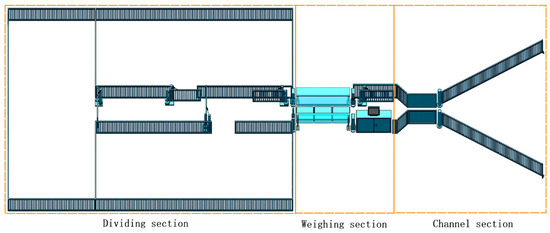 The system architecture is shown in Figure 2, with an overall choice of three weighing body splicing structures, with a single weighing body size set at (60 × 45) cm according to the body length and width of the goat. The main functional structure consists of the channel section, the weighing section, and the dividing section.