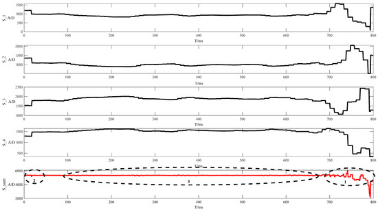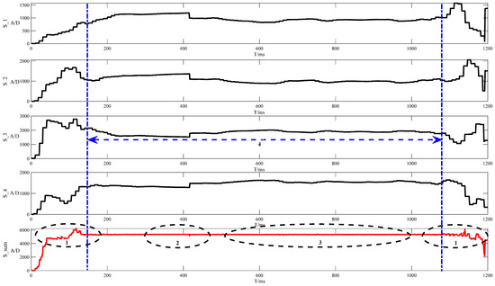 In Figure 6, S_1, S_2, S_3, and S_4, the AD values obtained by the four sensors of the weighing body are shown, and S_sum is the sum of the AD values obtained by the four sensors. To summarize: