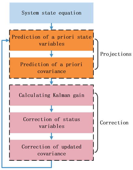 Using the first-order Kalman filter algorithm for data processing, the Kalman filter process was divided into two main steps, namely, the prediction phase and the correction phase. Prediction phase: An initial optimal estimate of the system state variables for the current round was made, and then the system covariance matrix was calculated for the current round of predictions. Correction phase: We calculated the Kalman gain, then corrected the a priori estimate using the residuals of the observed and predicted values, and finally updated the covariance matrix to provide the system with a basis for the next round of calculations, as shown in Figure 9.