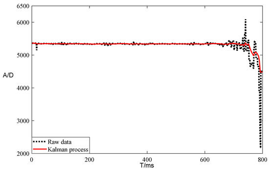 Based on the testing with Q set to 0.01 and R set to 0.05, the experimental results are shown in Figure 10, where the black dashed line represents the raw data, and the red line is the filtered data. As shown in the figure, the use of the first-order Kalman filter effectively removed the jitter in the horizontal section, although there was still minor jitter in the processing of the spiky data section, although the filtering effect was significant.