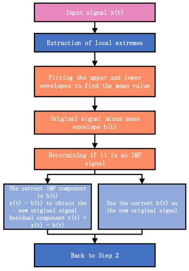 The empirical mode decomposition (EMD) method is an adaptive time-frequency localization analysis method proposed by Huang et al. [10,11,12]. Its basic functions are generated automatically, and it can decompose the raw signal into multiple intrinsic mode function IMF components and a residual, with each IMF representing the variation of the raw signal at different frequencies, while the residual reflects the slowly changing amount of data in the signal. The EMD algorithm steps are shown in Figure 11.