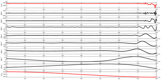 CK(t) is the intrinsic modal function component, and rn(t) is the residual component, which generally represents the average trend and is a constant or monotonic series. The raw signal EMD algorithm was decomposed as in Figure 12.