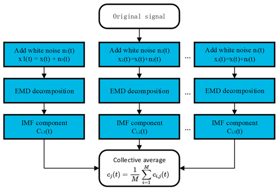As in Figure 12, there was multiple modal mixing of the IMF components of the raw signal, i.e., one IMF contained feature components at different time scales, and the conditions under which the EMD iterative process should be stopped lack criteria [16,17]. To solve the modal mixing phenomenon, Huang introduced a uniformly distributed frequency of 0-mean white noise into the raw signal to be analyzed so that signals of different time scales were automatically separated to their corresponding reference scales, which is the ensemble empirical mode decomposition (EEMD) algorithm, and the steps of the EEMD algorithm are shown in Figure 13 [18,19].