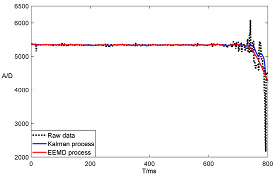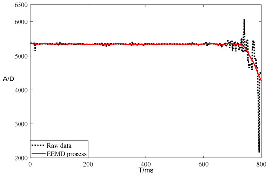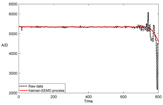 The raw data were processed by the EEMD algorithm, as shown in Figure 15. The red line is the processed data, and it started to fluctuate at the horizontal coordinate 600. In order to enhance the filtering effect, the Kalman filter was selected as the main control for the secondary filtering of the data. The processing effect is shown in Figure 17, where the red solid line shows the data processed by the Kalman-EEMD algorithm, and the black dashed line shows the change in the raw data. In comparison with Figure 10 and Figure 15, the Kalman-EEMD algorithm model had a better filtering effect than the filtering algorithm alone.