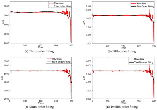 A polynomial fit was used to fit the raw data, and the fitting results are shown in Figure 18, with the red line representing the raw data and the black line the fitted data. The third-order fit and fifth-order fit in the figure are poor, and the fit graph appears to overshoot after exceeding the ninth-order. Through experimentation, the ninth-order fit was found to be the best. The results were compared with the Kalman-EEMD filtering effect, and the results are shown in Figure 19.