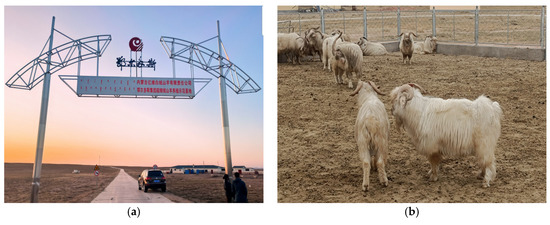 Field test site. (a) The Sanbei goat farm in Erdos. Erdos, Inner Mongolia Yivi White Velvet Goat Co., Erdos Group Superfine Velvet Goat Breeding Demonstration Base. (b) Albas white cashmere goats.