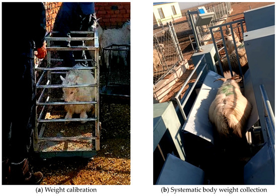 In Figure 20a,b, in order to test the field effect of the whole system, an experiment was conducted on 13 December 2021 at the Sanbei goat farm in Erdos, Inner Mongolia. A flock of 30 Albas white cashmere goats was selected for testing in the experiment. The actual weight of the goats and the corresponding ear tag number were recorded before the test, and then the flock was made to pass through the whole system three times.
