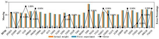 There were 30 sets of data in the experiment, as shown in Figure 22. In the first experiment, 16 sets of data had an error of 0, and only 1 set of data had an error of 1%, with an average error of about 0.32%. In the second experiment, as shown in Figure 23, seven sets of data had an error of 0, and two sets of data had an error of 1%, with an average error of 0.48%. In the third experiment, as shown in Figure 24, eight sets of data had an error of 0, and two sets of data had an error of 1%, with an average error of 0.40%. The total error was 0.40%.