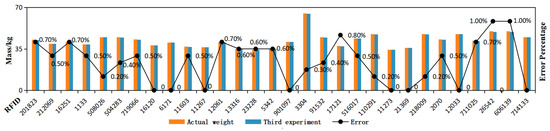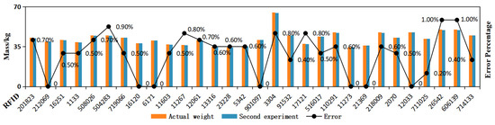 As can be seen from the above graphs, the field trial achieved the expected results. With improved weighing accuracy, the weighing rate of the sheep is guaranteed to be intelligent and scalable, which will provide a reliable data basis for the development of precise and ecologically sound animal husbandry. The minimum error between the actual weight and the measured value in the experiment was 0, the maximum error was 1.0%, and the average error was as low as 0.4%, demonstrating high accuracy. A total of 30 sheep passed through the whole system in about 54 s. The shortest time for a single sheep to pass through was 1.5 s, the longest time was 2 s, and the average time was 1.8 s.