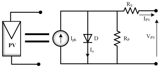 The PV cell has a p-n junction and produces electric power due to the photons. It consists of a current source Iph, a series resistance Rs, a shunt resistance Rp, and a diode, as shown in Figure 1.