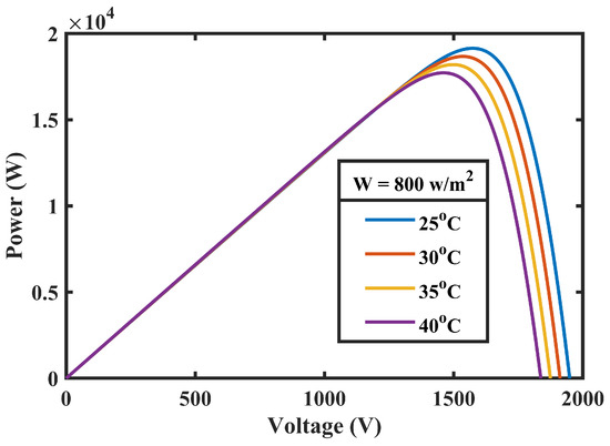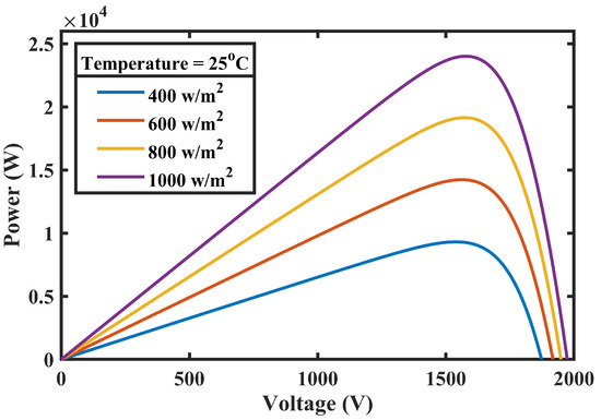 These figures illustrate the I-V and P-V attributes of the PV system, which are used in the current work and subject to different levels of irradiances and temperatures. Four PV arrays are linked in a series such that each array comprises of fifteen series modules and a total output of 24 KW power of the other two parallel strings.