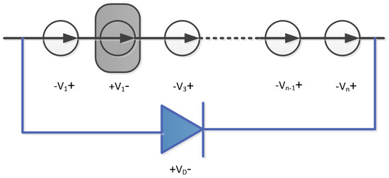 To prevent this, bypass diodes can be employed as depicted in Figure 4, which help to prevent a negative voltage across the shaded cells. From Figure 4, the bypass diode begins to conduct when the condition is satisfied where i ≠ 2 and is the forward voltage drop of the diode [29,30].