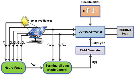 A controller design based on the nonlinear robust terminal sliding mode (TSM) is proposed for tracking the MPPT of PV arrays under PSCs using a non-inverting buck-boost converter. In this controller, the error, e1, is defined as the discrepancy between the desired output voltage of the PV array and the actual one and is given in Equation (17). The controller uses this error to adjust the reference voltage generated by the MLNFN algorithm and to extract the maximum power from the PV array,