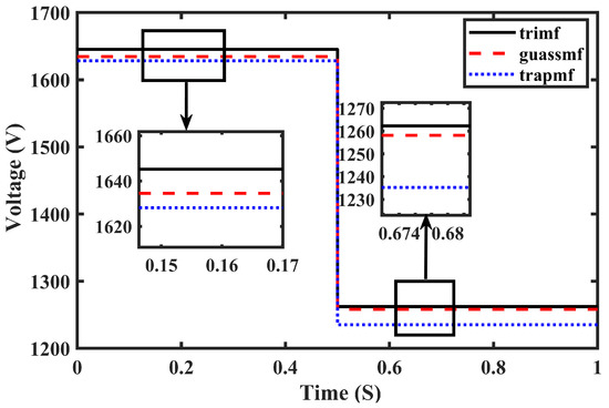 Figure 7 illustrates the reference voltages generated using the MLNFN against three different membership functions at shading pattern SP1, which lasts from 0 to 0.5 s, and SP2, which lasts from 0.5 to 1 s. The voltage changes abruptly from 1645 V to 1265 V when irradiances change from SP1 to SP2 in the case of triangular membership functions. Table 2 provides a comparative analysis of reference voltages generated using different NF techniques. The table helps in understanding the effectiveness of the proposed technique over the existing ones.