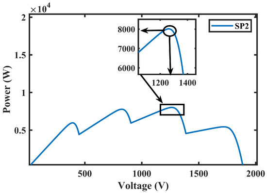 It was observed in the case of the SP1 scenario that the GMPP was situated at 1645 V and the associated output power was 15,000 W, as shown in Figure 11. While for the case of SP2, Figure 12 shows that MPP was at 1250 V and the associated output power was 8000 W. These results clearly show that the proposed MLNFN TSMC efficiently tracks the GMPP in the existence of local peaks.