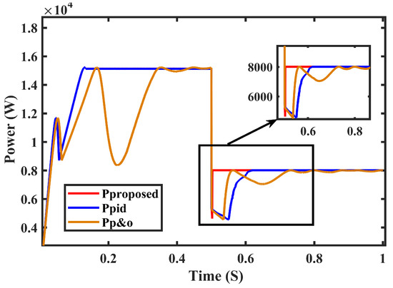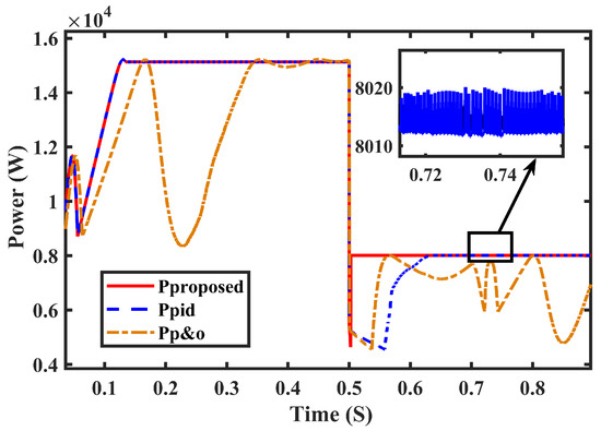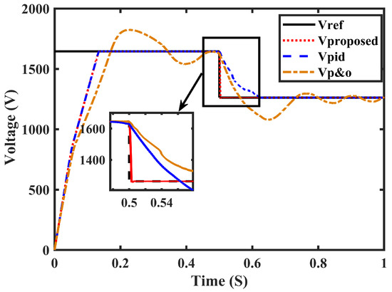Moreover, at the same time for the same system, the simulations run for conventional techniques (P&O and PID). As shown in Figure 13, the conventional techniques failed to track instantly the voltage at the time of dynamic change in the shading pattern; that was at 0.5 s when SP changed from SP1 to SP2. It can be noted that in this scenario the simulations were carried out without adding uncertainties in the system and it is clear from the results that the proposed method obtained success in tracking the MPP with a rapid response under different shading patterns.