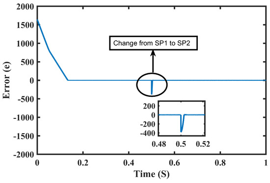 Figure 17 demonstrates that the proposed technique was successful in the instantaneous control of the duty cycle. When the shading pattern changes from SP1 to SP2 at 0.5 s then the duty cycle changes from 0.21 to 0.35. On the other hand, the error convergence was tested when the shading patterns changed from SP1 to SP2, which is shown in Figure 18.
