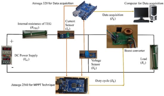 The proposed system has been validated through a practical experimental setup. The PV emulator used in this study is based on the single diode model, where the PV system acts as a current source with an antiparallel diode and intrinsic resistances. Literature shows that a PV cell is essentially a voltage source dependent on current, and its output current and open-circuit voltage (VOC) vary with changes in irradiance and temperature. Therefore, a DC power source with high current and low sensitivity can emulate the electrical characteristics of a PV system. The superposition of constant current, constant voltage, and diode activation effectively mimics the electrical behavior of a PV cell. The load was changed using a 500 W variable resistor, which in practical terms alters the maximum power delivery to the load and forces the algorithm to maximize the power at a changing load following the maximum power delivery theorem. The impact of irradiance was evaluated by suddenly changing the voltage of the DC current source. Figure 19 illustrates the physical connections among the PV system components such as the DC—DC buck-boost converter, sensors, microcontrollers for MPPT control, data acquisition, and load. The performance of the proposed MLNFN TSMC was compared to that of a ZN-tuned PID controller. The emulation function was limited by the variable current generation for the PV module. Table 7 lists the values of the components used for the practical application of control. Figure 20 shows the layout of the experimental setup.