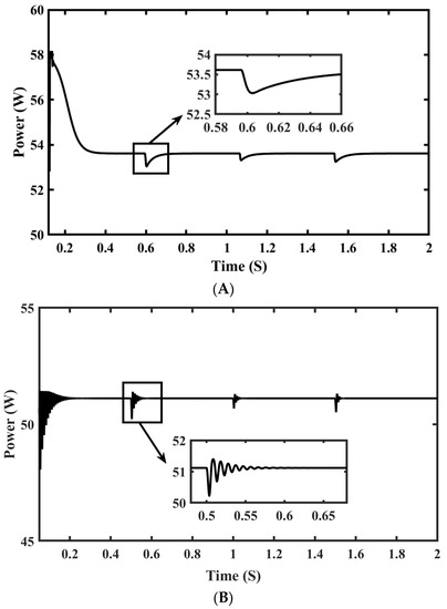 Figure 21 shows tracked power with dynamic load conditions by MLNFN TSMC and PID controllers. PID takes up to 250 ms for final GMPP settling as shown in Figure 21B. Oscillations which were unavoidable were noticed after 250 ms represented in magnification window, in addition to this less maximum power was achieved with PID. It added to power loss and decreased inefficiency. MLNFN TSMC tracks GM faster as compared to PID and settles at GMPP in 100–120 ms as shown in Figure 21A. MLNFN TSMC showed minimum oscillations after GMPP detection and consequently generated the least power loss in steady and dynamic states showing an 8.2% higher average power and 60% less control time. The performance in transition and final steady states was observed in the experiment, similar to the anticipated behavior in the mathematical model. Negligible fluctuations and the least settling time in experimental results reiterated better performance of MLNFN TSMC. Figure 22A,B, shows the reference voltages computed by the MLNFN TSMC and PID controller, respectively.