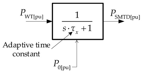 Figure 5 shows a simplistic representation of the developed varying transfer function block. The block consists of a first-order low-pass filter with adaptive time constant τx. The intermittent wind power signal, PWT, is applied to this block to obtain the expected smoothed power, PSMTD. For the purposes of this research, the time constant was designed so that it offers a numerical variation around the value of a fixed time constant, τ0. Thus, the input variable, x, can be modified in a range of numerical values greater than or equal to zero in order to produce a multiplier effect in base-10 at the fixed time constant, as expressed in Equation (11). Additionally, this block can be loaded with an initial output condition, P0, if the control objectives so require. The implementation of this block is presented in the upper subsystem of the general scheme of Figure 4, and the numerical values assigned to its parameters can be consulted in the Appendix A.