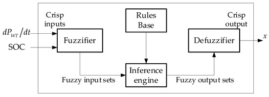 Figure 4 shows the general block diagram of the proposed controller. The algorithm takes as input the measurement of active power injected by the WT in per unit, PWT. This signal is applied, firstly, to the varying transfer function block, whose purpose is to generate a desired smoothed power profile, PSMTD, which must be achieved through controlled power injection by the SC–ESS, P*SC. This transfer function has a dynamic time constant which must be adjusted according to the real needs of smoothing and, with this, helps to improve performance in smoothing tasks. The time constant is calculated and updated in real time by a fuzzy logic controller (FLC), which generates a control signal x that obeys a series of rules imposed by the current state of the input variables dPWT/dt and SOC. The first variable corresponds to the temporary rate of change of the injected wind power (a measurement of the degree of its variability), and the second one is the state of charge of the storage system. The design and operation of the FLC are described in Section 3.2.