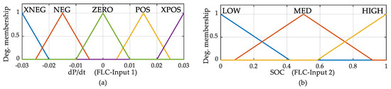 On the other hand, Figure 7 shows the membership functions of the FLC. The controller adjusts the time constant at each instant according to the variation in wind power and the SOC of the SC–ESS. Robust mathematics is required to establish the membership functions. An effective way to determine them is presented in the study carried out by the authors in Ref. [35]. For the design of fuzzy values, triangular and trapezoidal group membership functions are used. Table 1 shows the control rules for the strategy proposed in this paper. Finally, the centroid method is used for defuzzification.