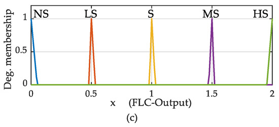 By adjusting the time constant (τx), the controller is able to fully charge/discharge the SC, thus improving the power smoothing effect. This paper presents the fuzzy logic controller (FLC) based on the centroid interference method shown in Figure 6. The proposed FLC has two inputs and one output. The inputs correspond to the fuzzification process and the output to the defuzzification process after applying the fuzzy rules:
