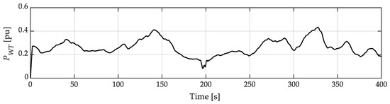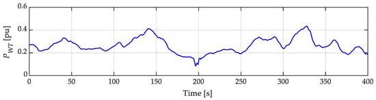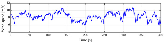 Firstly, the operation of the proposed control is validated in a computer simulation environment. For this, the models shown in Figure 1 and Figure 2 were used. The input variables for the simulations are a real wind profile with high variability of 400 s time horizon as shown in Figure 9. This record is from measurements taken at San Cristóbal wind farm (0°53′31.4″ S 89°29′56.2″ W, Galápagos-Ecuador) on 4 August 2015 at 51 m above the ground. The VSWT power output for this wind profile, computed with the mathematical models described, is shown in Figure 10.
