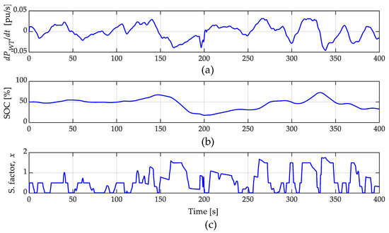Then, in Figure 11b the behavior of the SOC of the SC–ESS is observed. In the simulation, this dynamics was approximated by time-integration of the variable PSC (Figure 12) and applied as a second input signal to the FLC. In practice, this signal is accurately provided by the battery management system (BMS) of the SC–ESS. Finally, Figure 11c shows the resulting smoothing factor, x, at the FLC output. A close view of the latter plot shows correct compliance with the fuzzy rules established in Table 1 and illustrated in Figure 8.