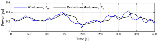 Finally, it is evident in Figure 13 that the power injected to the system, PT, is smoothed compared to the one with no smoothing. Then, the power fluctuations are flattened by reducing the power peaks and displacing them in certain cases; this effect depends on the state of charge of the SC and the decision of the controller. It is important to note that the proposed control system avoids peaks and valleys in the power curve.