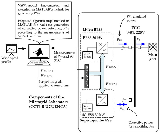 To validate the proposed control system, comprehensive laboratory experiments were performed in the test bench of the Microgrid Laboratory of the University of Cuenca, Ecuador [36]. The implementation scheme is shown in Figure 14. There, the wind power profile that is injected into the grid by the VSWT is emulated by a 50 kW lithium-ion BESS. For this, the real wind speed record of Figure 9 was taken and applied to the VSWT-model (Figure 1) and implemented and executed in MATLAB/Simulink. The output of this model provides, among others, the set-point P*WT, which is applied every 100 milliseconds to the lithium-ion BESS through microgrid control SCADA system. In parallel, the proposed control algorithm is implemented in a MATLAB script and run. The 30 kW SC–ESS unit exists in the laboratory (not emulated), is connected to the PCC and its inverter is in communication with the SCADA. The proposed control loop was designed so that the action of reading input data via SCADA (PWT, and SOC of SC–ESS) and the execution of the algorithm guarantee the writing of the P*SC variable in the 30 kW SC–ESS bidirectional power electronics converter (PEC) every 100 milliseconds. To achieve this computation time, it was necessary to implement the fuzzy logic controller (Figure 8) through a look-up table in the script. More technical details of the actual equipment lithium-ion BESS-50 kW (used for wind turbine emulation) and 30 kW SC–ESS used in the laboratory are provided in Appendix C.