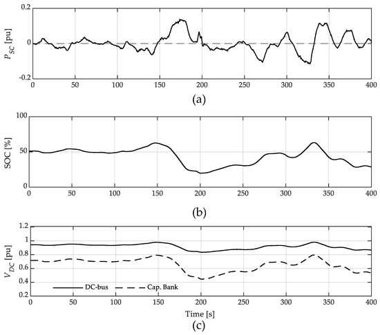 The output of the proposed control generates the reference for SC–ESS, which is achieved by the actual SC–ESS unit in the laboratory (Figure 16a). Where the SC is subjected to different charge/discharge cycles depending on the unsmoothed VSWT power curve and the controller, it is evident in Figure 16b that the SOC levels of the SC–ESS remain within secure values (within the 10–90% for the real SC–ESS prototype). The proposed algorithm is implemented and run in MATLAB in real time to generate the reference signal of the energy storage system of the SC–ESS. The SC–ESS receives an active power command generated by the algorithm implemented in the SCADA every 100 milliseconds, as mentioned. Finally, Figure 16c shows the dynamics of the DC voltage at different stages of the SC–ESS: at the terminals of the supercapacitor bank (dashed line) and the DC-bus at the output of the boost converter upstream in the three-phase inverter (continuous line).