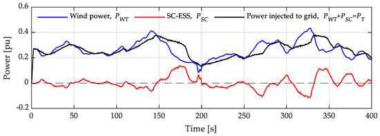 As expected, in Figure 13, the result of the proposed control system effectively reduces the VSWT fluctuations. In this case, Figure 17 shows the effectiveness of the method when comparing the original injected wind power and the combined effect of this with the power provided by the SC–ESS. The dynamics of the resulting active power injected into the grid (PWT + PSC = PT) show the effectiveness in the smoothing tasks. In this case, a smoothing of 22% is achieved (i.e., the variance of the compared time series is reduced by 22%). It is important to mention that, for the laboratory experiment, an initial time constant of τ0 = 0.5 s was assigned to the algorithm (Figure 4) to avoid rapid discharge of the SC–ESS. However, it has been shown both in simulation and in experimental tests that larger values of this parameter, for example τ0 = 2.0 s, can improve the effectiveness of smoothing tasks.