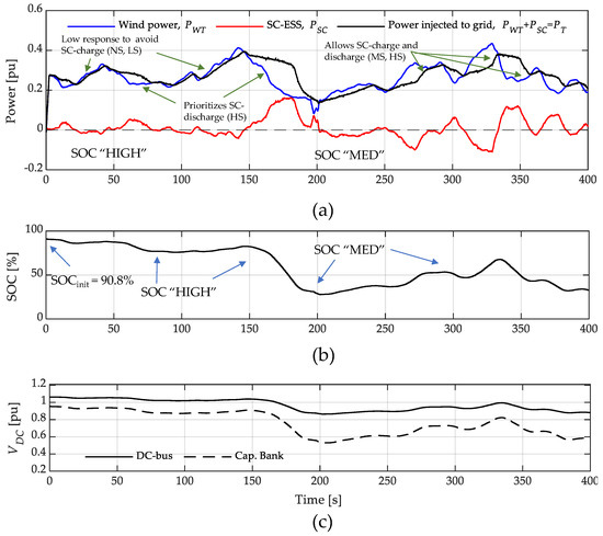 Experimental results in SC–ESS undercharge condition: (a) original injected wind power (blue), power delivered by SC–ESS (red), combined wind-supercapacitors effect with the smoothing algorithm (black); (b) evolution of SOC; (c) DC voltage of the supercapacitor array upstream of the inverter.