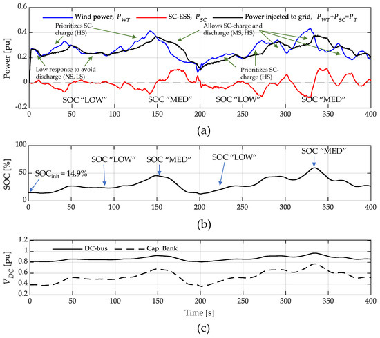 To evaluate the proposal’s effectiveness with the overcharged condition, the SC–ESS was prepared with an initial state of charge of 90%. Now, according to the fuzzy rules of Table 1, when the SOC has “HIGH” levels, the proposed method proceeds to smooth the wind power prioritizing the discharge of the SC–ESS by responding strongly to negative slope wind power (dPWT/dt < 0): high smoothing (HS) and moderate smoothing (MS). On the contrary, when dPWT/dt > 0, the SC–ESS responds weakly to limit its recharge and move it away from the overcharge condition: little smoothing (LS) and no smoothing (NS). Then, as the SOC decreases to a medium level, “MED”, the degree of smoothing equalizes for both positive and negative sloped wind power variations (Figure 18a), substantially improving smoothing tasks. Finally, when the SOC reaches its “LOW” value, the method forces the SC–ESS to prioritize its charge instead of its discharge, reducing the effectiveness of the smoothing when dPWT/dt < 0 (LS and NS) and boosting it when dPWT/dt > 0 (MS and HS). Response of the SC–ESS dependent on the level of the SOC and the variability of the power to be smoothed (dPWT/dt) guarantees the effectiveness in power smoothing while maintaining the volatile SOC of an SC–ESS within safe operating limits. In this first case, a smoothing of 16% is achieved. Similar reasoning can be applied to explain the test in the undercharged condition (initial SOC of 15%), whose results are shown in Figure 19. In this case, a smoothing of 24% is obtained.