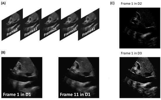 Process of creating the augmented datasets. (A) Frames extracted from a US video and segmented by the operator. (B) Example of a pair of consecutive frames. (C) Examples of images included in the two datasets obtained applying Equation (1): dataset 2 provides information on IVC movement; dataset 3 includes images including both information on the anatomy and on the movement of tissues.