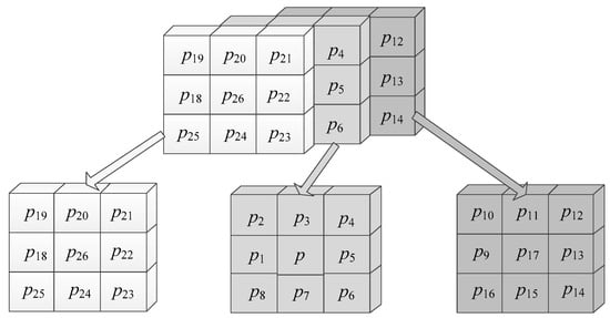 A 3D image can be described as an array of volume elements, or voxels. For the binary case, a 3D image can be considered as a relation or function f: Σ→{0, 1}, which maps from Σ to the set {0, 1}. To determine the adjacency between voxels in the image, a pair of voxels P = (a1, a2, a3) and Q = (b1, b2, b3) are considered to be 6-adjacent if their Manhattan distance is equal to 1, i.e., |a1 − b1| + |a2 − b2| + |a3 − b3| = 1. Alternatively, P and Q are considered to be 26-adjacent if their Chebyshev distance is equal to 1, i.e., max (|a1 − b1|, |a2 − b2|, |a3 − b3|) = 1. As illustrated in Figure 1, p1, p3, p5, p7, p17 and p26 are 6-adjacent to voxel p, and voxels p1, p2,…, p26 are 26-adjacent to voxel p.
