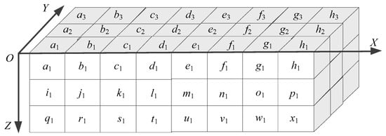 In is known that a 2 × 2 × 2 voxel pattern consists of eight voxels, and each of them is either a foreground voxel or a background voxel. Accordingly, there will be 256 different types of configurations formed by the eight voxels, theoretically. To determine a voxel pattern’s configuration as found in the image, it is necessary to check it from all orientations. In practice, it is difficult to determine the voxel patterns’ configurations occurring in the image from all orientations. To address this issue, Morgenthaler summed up the Euler number increments of 256 different types of voxel patterns in the VP algorithm and listed their increments (see Table 1). The table lists the Euler number increment ΔE of voxel patterns that are not zero according to an index generated by the values of voxels in the voxel pattern. For instance, for the voxel pattern presented in Figure 3, if the values of voxels a, b, c, d, e, f, g and h are 1, 0, 1, 1, 1, 1, 1 and 1, respectively, the index should be 10111111, and from Table 1, it can be concluded that the Euler number increment of the current voxel pattern will be 1. In other words, once this pattern is found in the image, the Euler number of the image should be increased by 1. The Euler number increments of the other voxel patterns should be decided using a similar method.